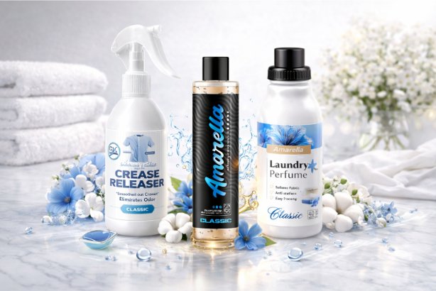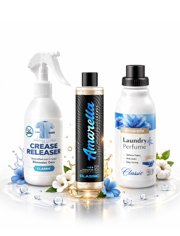 Komplet vsebuje parfum za perilo, parfum za perilo z mehčalcem in sprej za odstranjevanje gub.