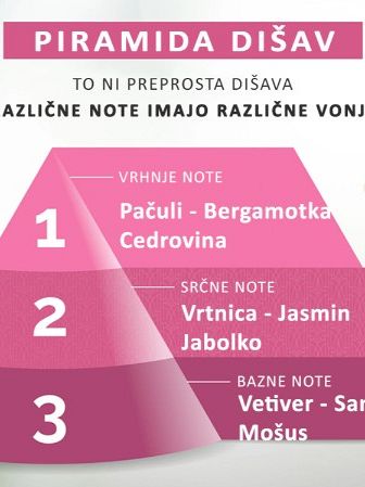 Očarala vas bo kombinacija pačulija in bergamotke, z nežnimi toni jasmina ter jabolke in pridihom mošusa.